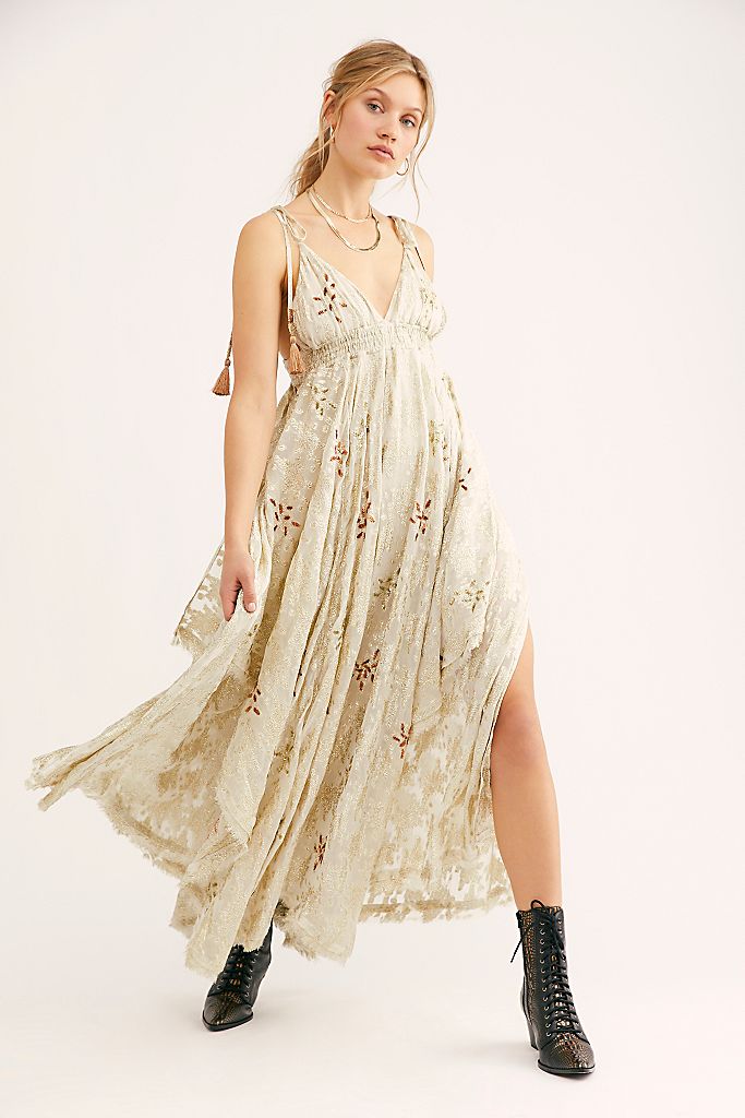 Silk, vintage, feminine, dreamy, the list of words for this gown in my opinion are endless. Designed for a special collaboration between Spell and The Gypsy Collective and Free People, this silk dress with a floral jacquard fabrication and low, v neckline emits a vintage design perfect to release your inner fantasy to be a floaty fairy.
