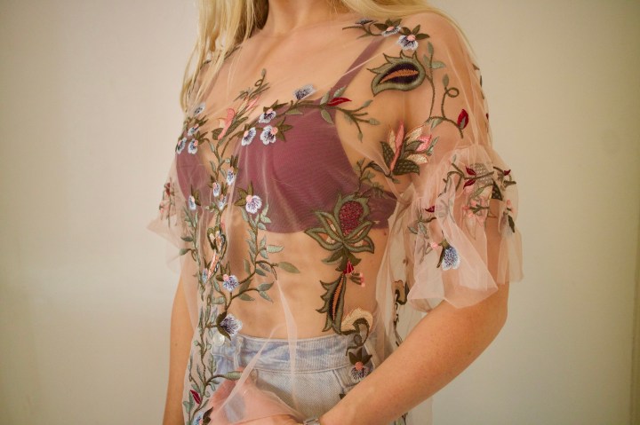 This floral appliquéd tulle top embodies every element of femininity. The pale pink and delicate net top with beautiful embroidery tends to be more popular for the more ‘feminine’ persona. This beautiful top allows me to fulfil my dream of being a dainty fairy, fluttering around a rose garden. This top can be worn singularly with a bra underneath like I have chosen to do or if you are feeling slight less comfortable, pair with a pale pink body underneath.